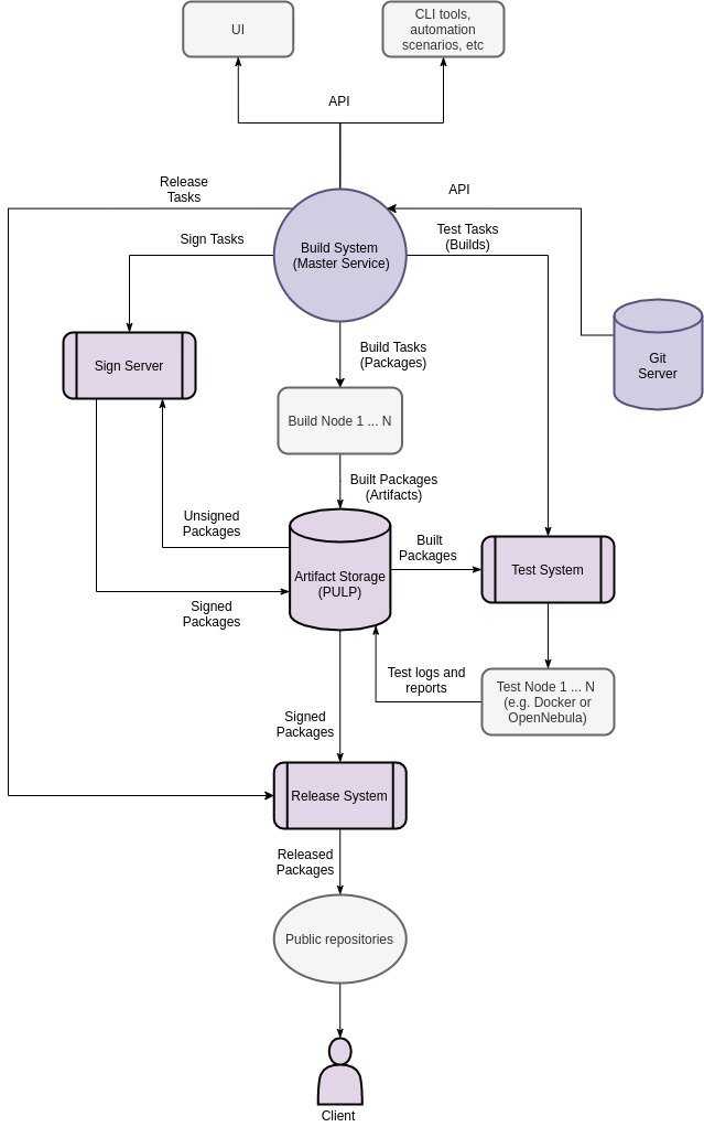 Test System发送请求并接收Test Tasks (builds)以测试来自Artefact Storage的构建包。Test System通过Test Nodes(例如具有不同架构的Docker或OpenNebula)来测试软件包,并将测试工件或测试日志和报告发送回Artifact Storage。